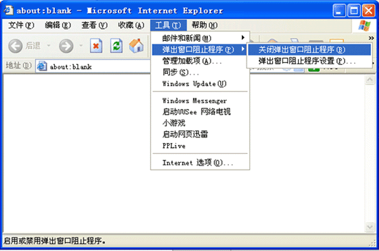 1.在IE菜单中,选[工具]->[弹出窗口阻止程序]